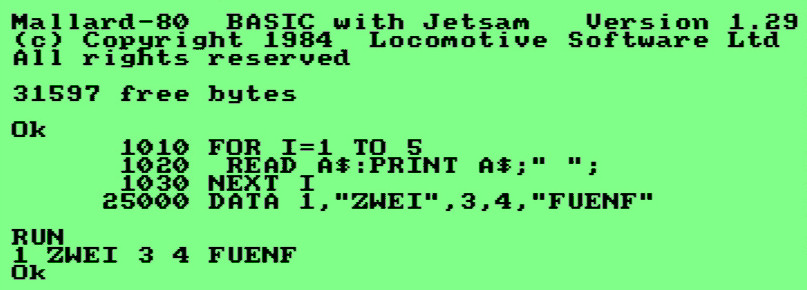 Ein Computerfreund wandte sich unlängst mit einer Frage an mich. In einem Programm sollten auch numerische Daten als Strings eingelesen werden, was nach den BasiCode-Vereinbarungen nicht zugelassen ist, bei READ A$ MUSS an der betreffenden Stelle in den DATAs eine Stringvariable stehen, bei READ A eine numerische. Unter dem Java-Bascoder von Jens Müller wurde dementsprechend auch mit einer Fehlermeldung abgebrochen. Ich testete die Situation als erstes im online-Browser von Rob Hagemans – doch dort funktionierte es, ohne einen Fehler zu melden: